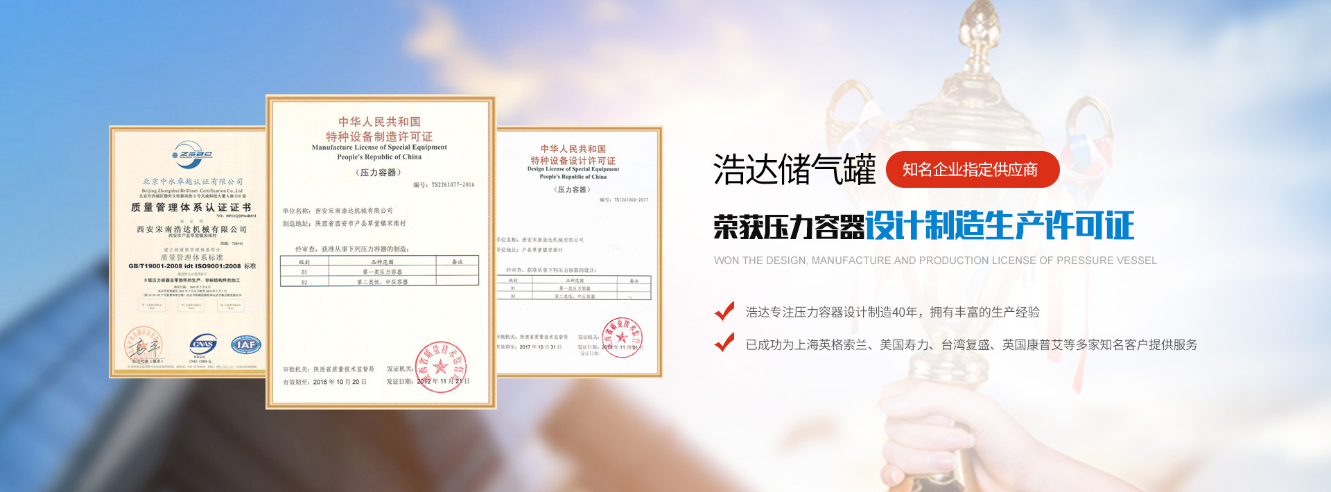 誠信經(jīng)營40余年現(xiàn)有壓力容器/不銹鋼儲氣罐設(shè)計(jì)、制造、C級鍋爐生產(chǎn)許可證,是部級先進(jìn)企業(yè),省級安全生產(chǎn)單位,市級標(biāo)準(zhǔn)化先進(jìn)企業(yè),市級重合同、守信譽(yù)單位,二級計(jì)量企業(yè)。